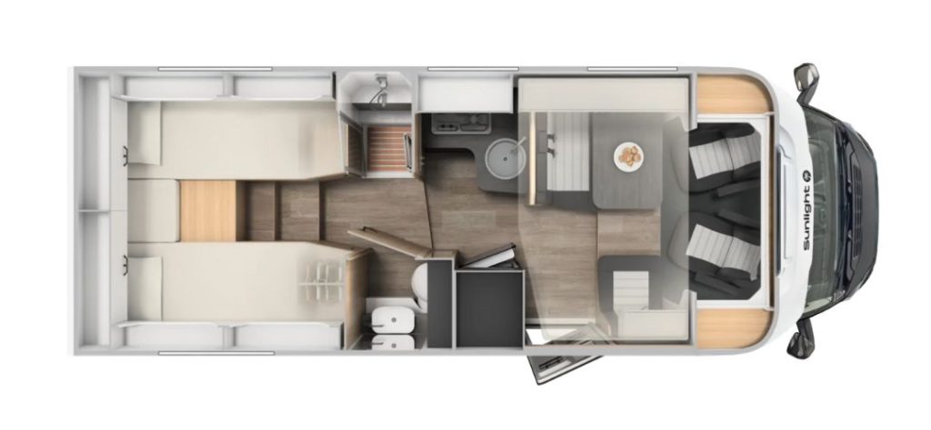Providing ultimate flexibility, the T68 features two single beds at the rear which can also be converted into a double, and a drop down bed in the living area for extra berths. In the T68 you can enjoy all your home comforts including separate toilet and shower rooms, gas burner hob, oven, grill and fridge-freezer. Available as both pet friendly and none pet friendly.